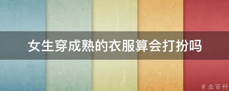 最佳答案女生穿成熟的衣服算会打扮,成熟的打扮可以凸显人的稳重和成熟的形象。随着年龄的增长,一些时尚流行的衣服或者发型并不适合穿在自己身上,会显得很幼稚或者很俗气。穿着得体,举止从容,会给人一种知性大气、不张扬但有内涵的感觉,进而促进个人自信心的提升,更加能在人际交往中表现出自己的特点。