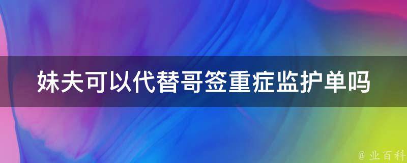 妹夫可以代替哥签重症监护单。如果生病在医院里监护人只有妹夫,并且本人没有自理能力,那么妹夫可以作为监护人签字,并且需要在医院进行陪床,如果不进行陪床的话,可以找护工进行监护。父母、配偶、子女等直系亲属或关系人都可以签字。