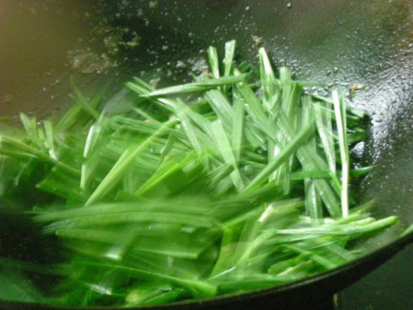 6、锅里放少量油,把韭菜放进去煸炒一下。