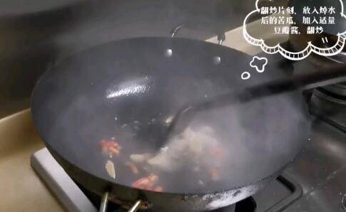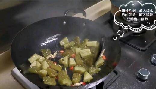 4、放入焯过水的木瓜,加入豆瓣酱,煸炒2分钟。