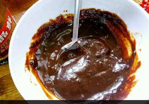3、准备香其酱、豆瓣酱、甜面酱。把上述酱混合待用。