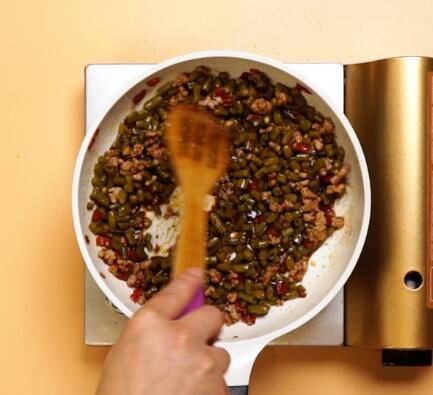 倒入老抽,翻炒均匀,倒入酸豆角,翻炒均匀。
