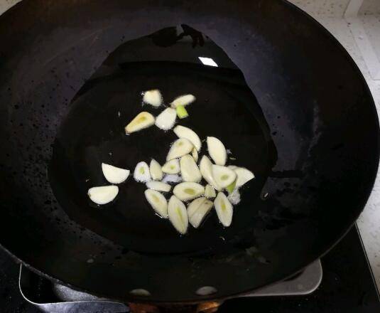 2、锅中热油,放入切好的蒜片爆香。