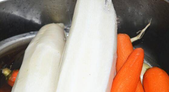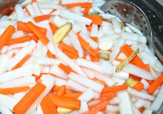 白萝卜、胡萝卜、盐、生姜、大蒜、白砂糖、白醋、凉白开水、柠檬汁。