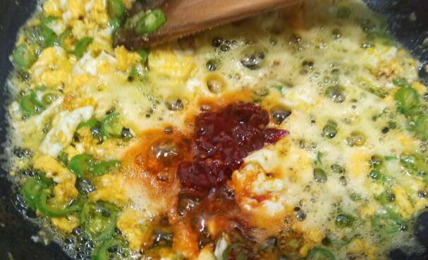 加入青辣椒炒香,加入一勺豆瓣酱,翻炒一下。