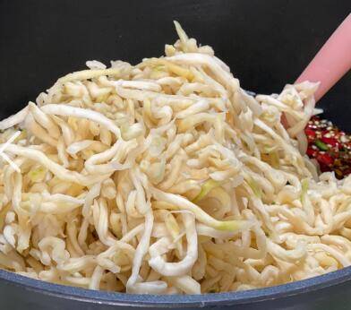放进木瓜丝,搅拌均匀,以便更入味,放置一个晚上即可食用。