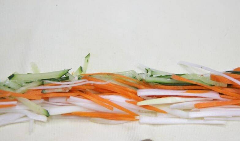 7.然后在桌面把豆腐皮摊开,放入刚才切好的三种配菜丝。