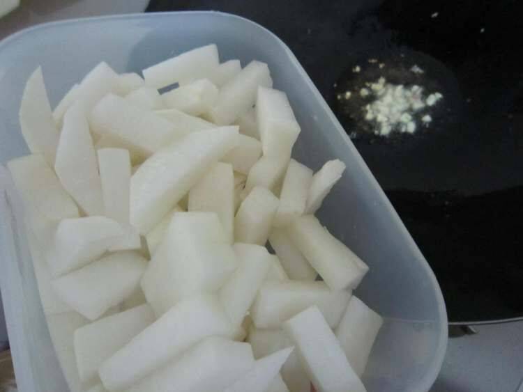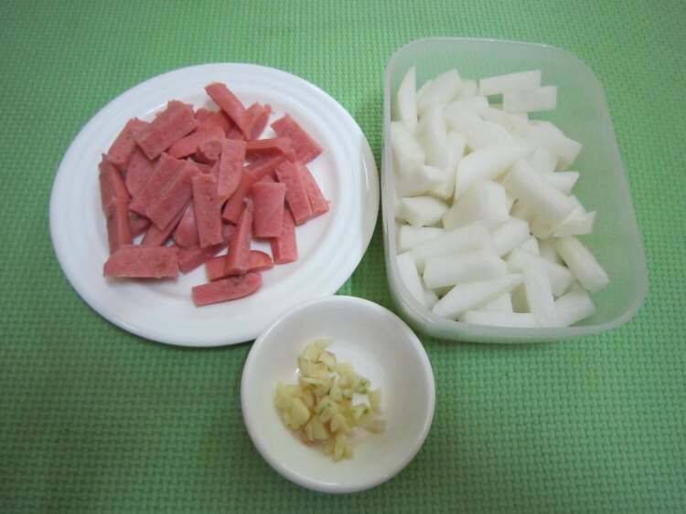 1、食材准备:白萝卜300克、香肠3条、油、盐、大蒜、蚝油、生抽各适量。