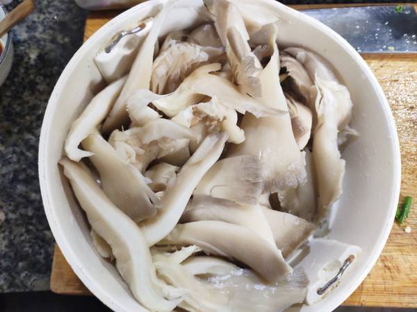 2、将平菇洗净,撕成小朵。