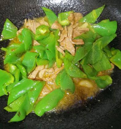 炒至肉色变白,加入辣椒翻炒,加入蚝油、生抽、老抽、盐适量。
