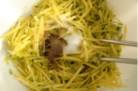 吊瓜200g、面粉200g。吊瓜洗净用擦子擦成细丝,放盐和胡椒拌匀,杀出水来。
