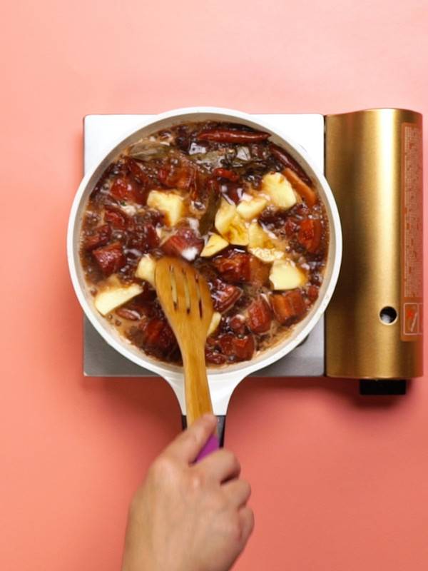 5、倒入土豆块,翻炒均匀,加入生抽,盐,小火炖15分钟。