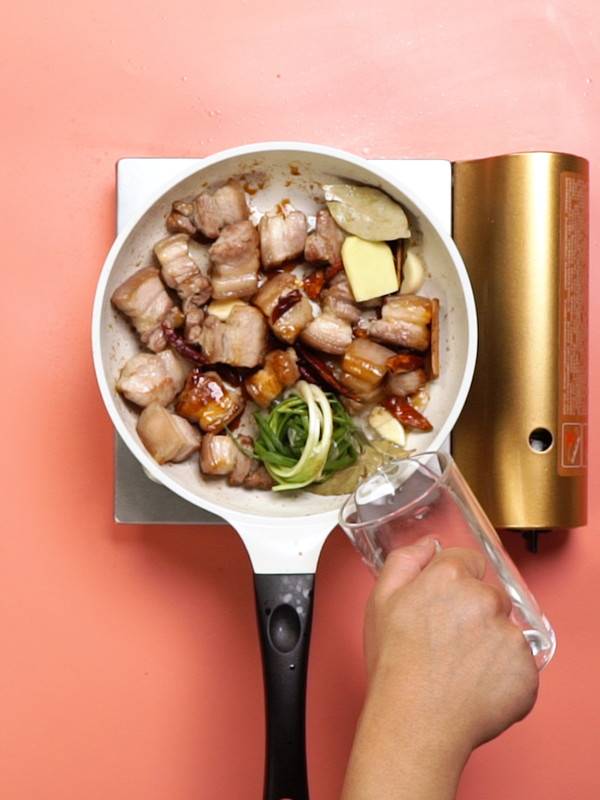 3、锅中放油,加入冰糖,小火炒糖色,倒入五花肉,翻炒均匀。