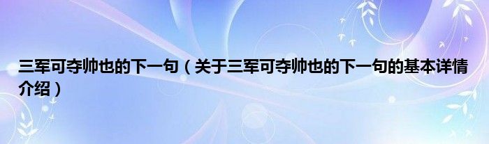 大家好我是小蝌蚪,三军可夺帅也的下一句,关于三军可夺帅也的下一句的基本详情介绍很多人还不知道,那么现在让我们一起来看看吧!
