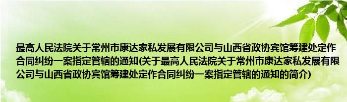 本文关于最高人民法院关于常州市康达家私发展有限公司与山西省政协宾馆筹建处定作合同纠纷一案指定管辖的通知的简介就讲解完毕,希望对大家有所帮助。