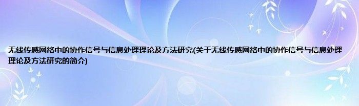 大家好,无线传感网络中的协作信号与信息处理理论及方法研究,关于无线传感网络中的协作信号与信息处理理论及方法研究的简介很多人还不知道,现在让我们一起来看看吧!